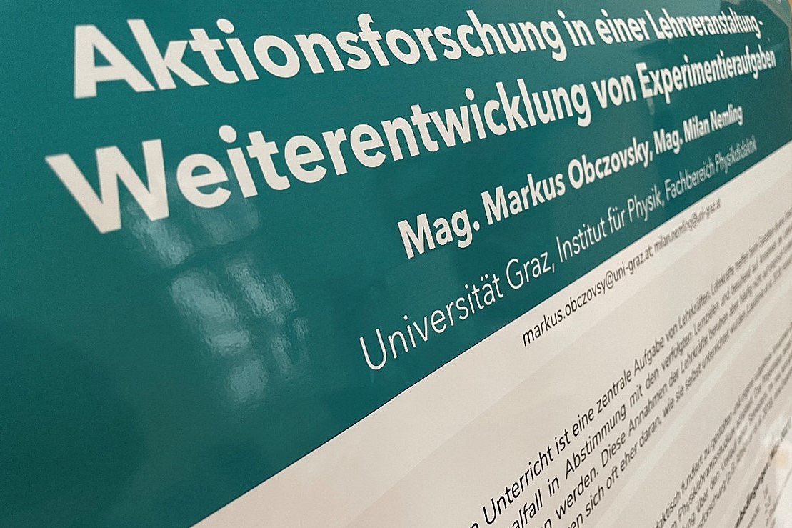 Der Fachbereich Physikdidaktik ist mit zwei Postern vertreten, auf denen zwei Lehrveranstaltungen vorgestellt wurden, die Studierende bei solch einer forschenden Herangehensweise beim Reflektieren des eigenen Unterrichtshandelns zu unterstützen.